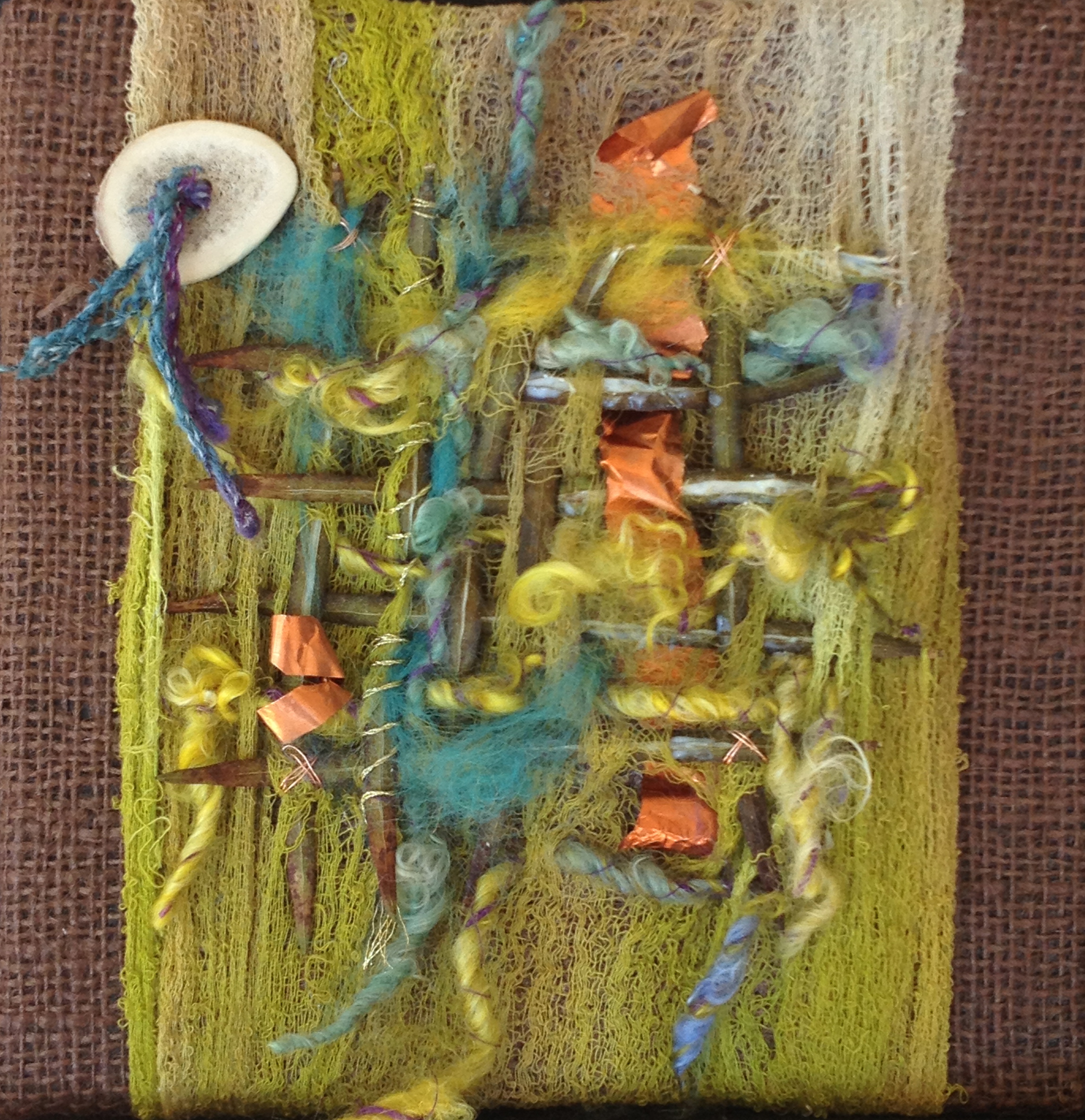 Pods and Fiber Published September 23, 2012 at 2296 × 2370 I’m finally finshed! After fighting each other, this finally came together with yarn, burlap, thread, foil,pods, and even a bone button! Share this: Click to print (Opens in new window) Print PocketMoreTweetShare on Tumblr Click to share on Reddit (Opens in new window) Reddit Click to share on Instagram (Opens in new window) Instagram Like Loading...
